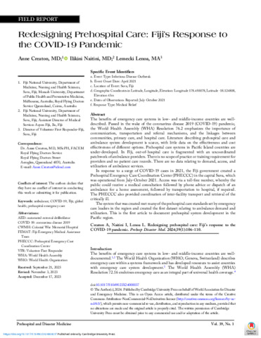 Creaton, Anne, M, D, Naitini, Ilikini, Lenoa, Lemecki and M, A (2024) Redesigning Prehospital Care: Fiji’s Response to the COVID-19 Pandemic. Redesigning Prehospital Care: Fiji’s Response to the COVID-19 Pandemic, 39 (1). pp. 106-110.
